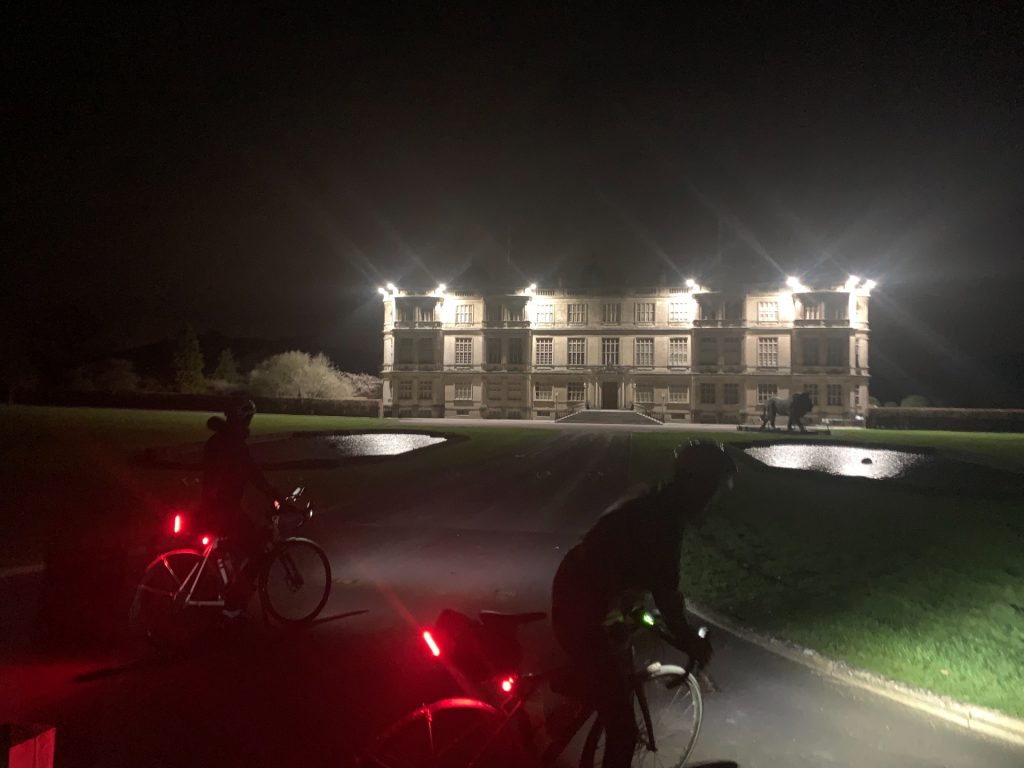 The first half of the night section was great, pushed along by the wind, making good time. Riding past Longleat House in the dark was epic. Then I misread my Garmin and ended up doing an involuntary circuit of Longleat, adding a couple of miles before getting to a point where I thought “this hill looks familiar”. It was. Hill 23/26 was ridden twice. So be it. I was getting empty, but a Spar shop was still open in Frome, and I was able to get a couple of bottles of milkshake, one to overcome the impending bonk and one for later.